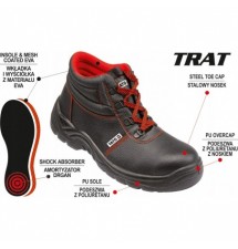 Trzewiki robocze z serii TRAT S1 to model z wytrzymałym na uderzenia stalowym podnoskiem oraz ze specjalnie zaprojektowanym, nachodzącym na czubek buta fragmentem podeszwy, który zapobiega uszkodzeniom w tej części.