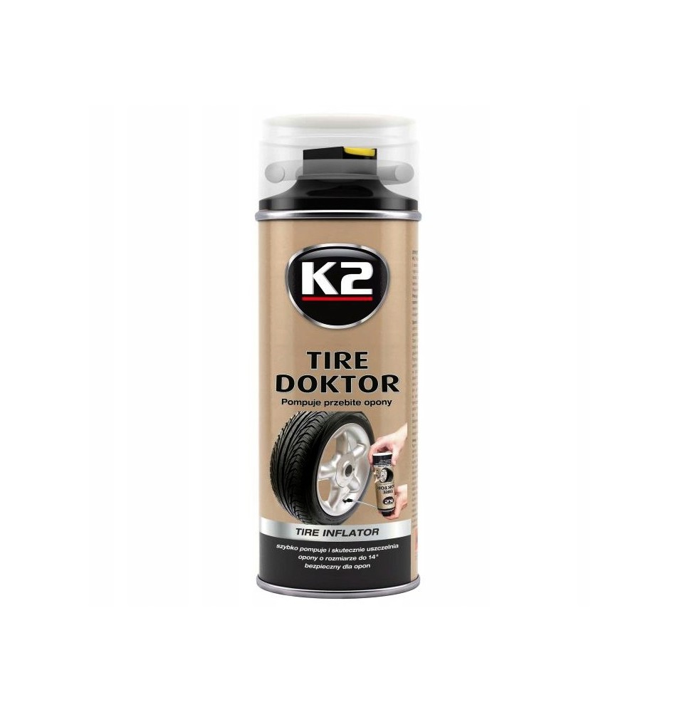 K2 Tire Doktor szybko i skutecznie pompuje i uszczelnia przebite opony - tymczasowa naprawa bez demontażu i użycia narzędzi. Aerozol pompuje oponę, a specjalna lateksowa formuła uszczelnia dziurę. Preparat nie wpływa na wyważenie koła. Pompuje większość opon, aż do rozmiaru 235/70-16.