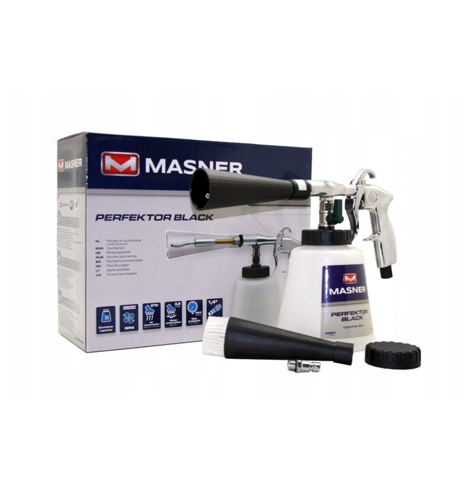 Udoskonalona wersja sprawdzonego urządzenia PERFEKTOR BLACK. Standardowy wężyk czyszczący wewnątrz tuby został zastąpiony dyszą na łożysku, dzięki czemu urządzenie jest jeszcze bardziej skuteczne i trwałe. Pistolet PERFEKTOR BLACK przeznaczony jest do czyszczenia na mokro wszelkiego rodzaju zabrudzeń tapicerki, karoserii, elementów z tworzywa sztucznego, nawiewów powietrza, dywaników, oraz innych trudno dostępnych miejsc. Jest w całości wykonany z metalu, dzięki czemu jest odporny na wszelkiego rodzaju uszkodzenia mechaniczne. Jego ergonomiczny kształt ułatwia pracę i redukuje zmęczenie ręki. Wyposażony jest w duży, litrowy zbiornik na płyn czyszczący. Zamontowana w pistolecie dysza wytwarza pod wpływem sprężonego powietrza spieniony roztwór czyszczący. Piana jest nanoszona na element pod wysokim ciśnieniem, dzięki czemu czyszczenie jest bardzo skuteczne. Posiada płynną regulację przepływu powietrza oraz ilości pobieranego płynu.
